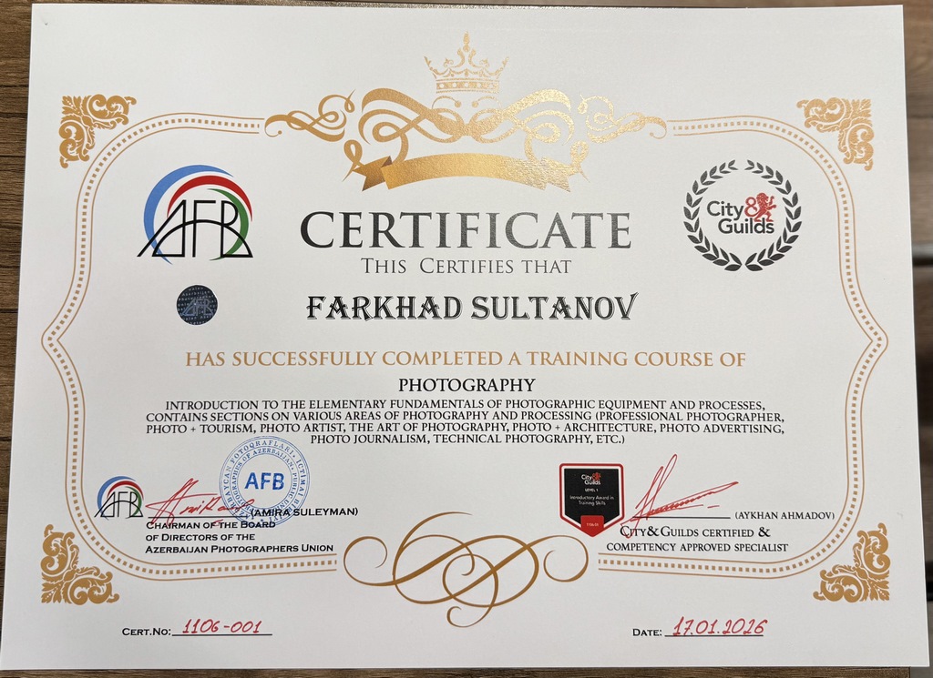 AFB ilə Böyük Britaniyada fəaliyyət göstərən City & Guilds beynəlxalq sertifikatlaşdırma qurumu arasında qurulan əməkdaşlıq çərçivəsində keçirilən fotoqrafiya təlim kursunu uğurla başa vuran Fərhad Sultanov beynəlxalq sertifikata layiq görülüb.